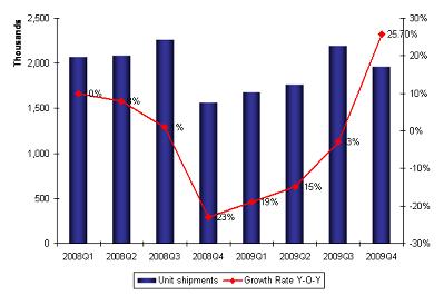 Total India personal computer shipments have grown for the last four consecutive quarters of 2009 after dropping sharply from a peak of 22.6 lakh units in July-September 2008 to 15.6 lakh units in October-December 2008. Notably, home PC shipments (both desktops and notebooks) climbed a significant 38 per cent in year-on-year (October-December 2009 over October-December 2008).