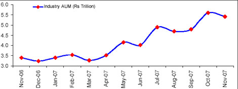 The mutual fund industry's assets under management (AuM), however, fell to Rs.5.42 trillion in November, against an all-time high of Rs.5.60 trillion recorded in October 2007.